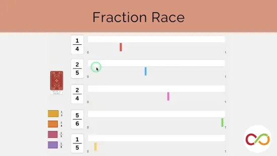 Students build an understanding of fraction magnitude and equivalence by predicting whether their card is greater or less than the dealer’s.